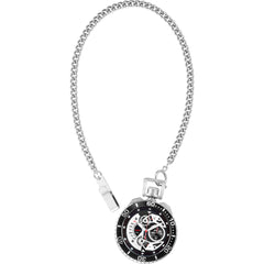 Invicta 35437 men's Pro Diver silver and black dial pocket watch is offered, in a polished solid stainless steel case. This model is made in dimensions of 49mm across and 18mm high. This watch has a unidirectional rotating silver tone accented black bezel and a textured push/pull main crown with function pushers. Invicta 35437 is equipped with a black genuine leather strap. Securing the strap is a pin buckle clasp made in stainless steel. This watch also comes with a comfortable black leather strap and silver stainless steel chain.