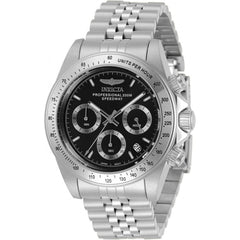 Invicta 30989 men's Speedway silver bracelet chronograph watch is offered, in a polished solid stainless steel case. This model is made in dimensions of 40mm across and 13mm high. This watch has a fixed bezel and a textured screw down main crown with function pushers. Invicta 30989 is fitted with a silver stainless steel bracelet. Securing the bracelet is a fold over safety lock clasp made in stainless steel.