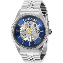 Invicta 36438 men's Specialty blue skeleton dial ss bracelet watch is offered, in a polished solid stainless steel case. This model is made in dimensions of 43mm across and 12mm high. This watch has a fixed bezel and a textured push/pull main crown. Invicta 36438 is fitted with a silver stainless steel bracelet. Securing the bracelet is a fold over safety lock clasp made in stainless steel.
