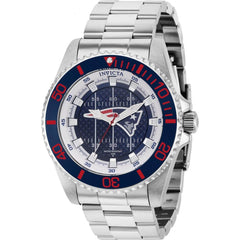 Invicta 36921 men's NFL New England Patriots bracelet quartz watch is offered, in a polished solid stainless steel case. This model is made in dimensions of 47mm across and 14mm high. This watch has a unidirectional rotating red and blue accented silver tone bezel and a textured push/pull main crown. Invicta 36921 is equipped with a silver stainless steel bracelet. Securing the bracelet is a fold over safety lock clasp made in stainless steel.