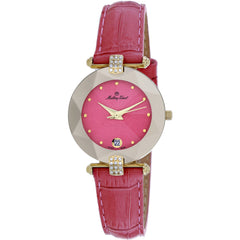 Mathey Tissot P317F women's Pyramide watch is offered, in a yellow gold plated stainless steel case with push-pull crown. This watch measures 26mm across . This watch is fitted with a pink leather strap. Securing the strap is a buckle clasp.