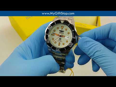 Invicta 10640 Grand Diver men's dive watch features a 47mm wide and 16mm thick solid stainless steel case with a scalloped edge unidirectional rotating black bezel and textured screw down crown. Invicta 10640 is powered by an accurate Japanese TMI NH35A automatic movement with 24 jewels. This stylish watch also features a textured milky white dial with orange accents black luminous hands and hour markers along with the date display functions, scratch resistant mineral crystal and water resistant to 300 meters. Invicta 10640 is equipped with a 22mm wide solid stainless steel bracelet with a fold over safety lock clasp. Invicta 10640 men's Grand Diver automatic lume white dial steel bracelet dive watch is brand new and comes in an original Invicta gift box and is backed by a 3 years limited warranty.